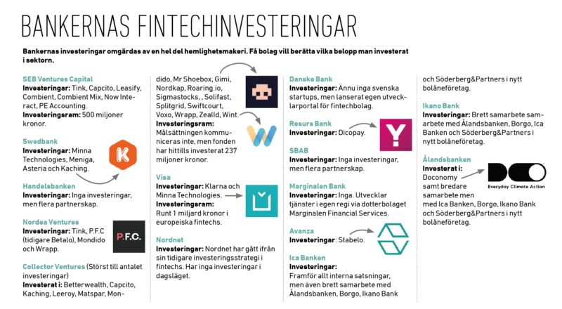 Fintech Får några år sedan var det otänkbart, men sakta och säkert investerar och samarbetar bankerna allt mer med fintechbolag. Finansliv har kartlagt bankernas investeringar.