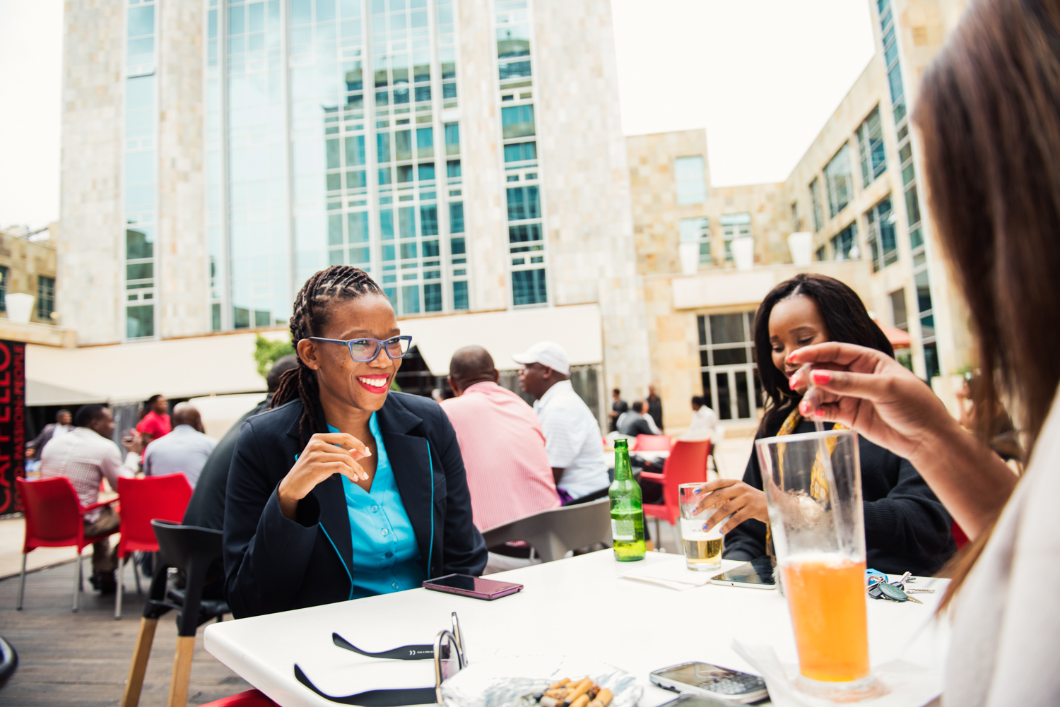 ”Jag vill bredda mina kunskaper och lära ännu mer om ny teknik”, säger Barclays chef för digitala kanaler, Refilwe Sharon Bogosi som här träffar vännerna Dineo och Tumi på Masa Square i Gaborone.