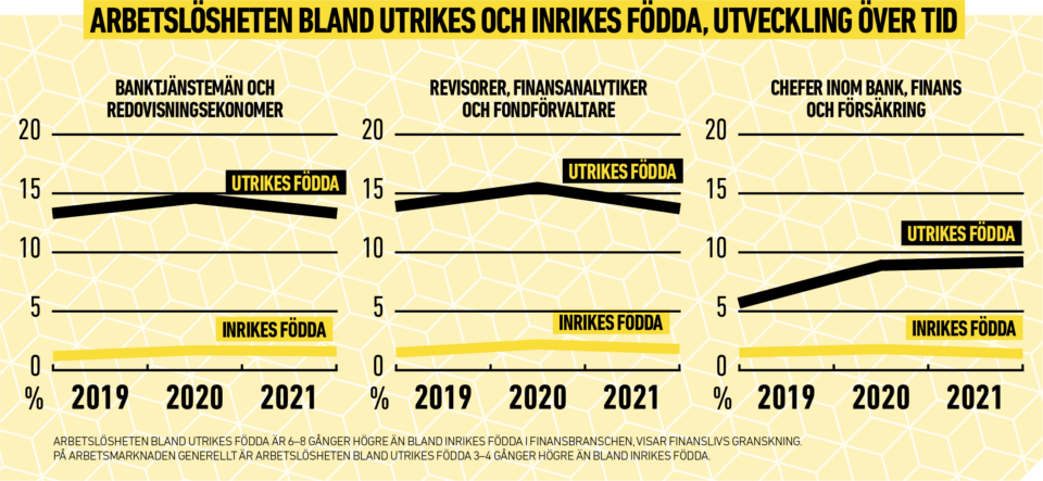 Genom att jämföra Statistiska Centralbyråns statistik över antalet utrikes födda respektive inrikes födda i varje yrkesgrupp med Arbetsförmedlingens statistik över arbetslösa i grupperna syns en tydlig snedfördelning. Utrikesfödda är kraftigt överrepresenterade bland de arbetslösa i finansbranschen.