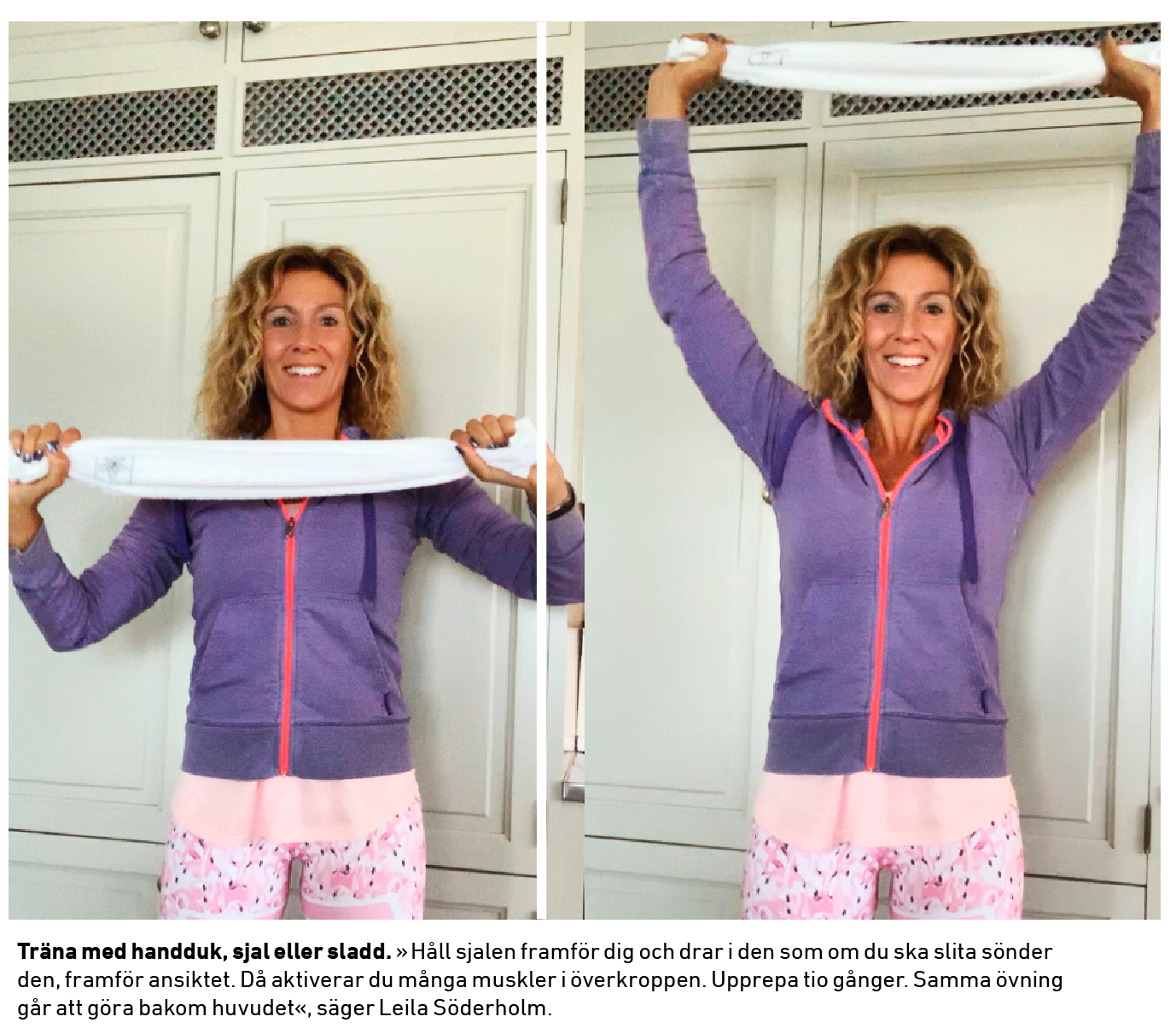 Leila Söderholm brukar också ofta använda en handduk, en sjal eller en sladd som redskap för att träna axlar, rygg och nacke.