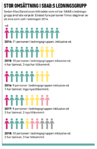 Det märks inte minst i den stora omsättningen på chefer, uppger källor till Finansliv. Under de snart fem år Klas Danielsson varit vd har minst en person, oftast två eller fler, bytts ut i SBAB:s ledningsgrupp varje år. Nu är endast fyra personer kvar av de elva som fanns i ledningsgruppen 2014, då han tillträdde. En av dem är Klas Danielsson själv.