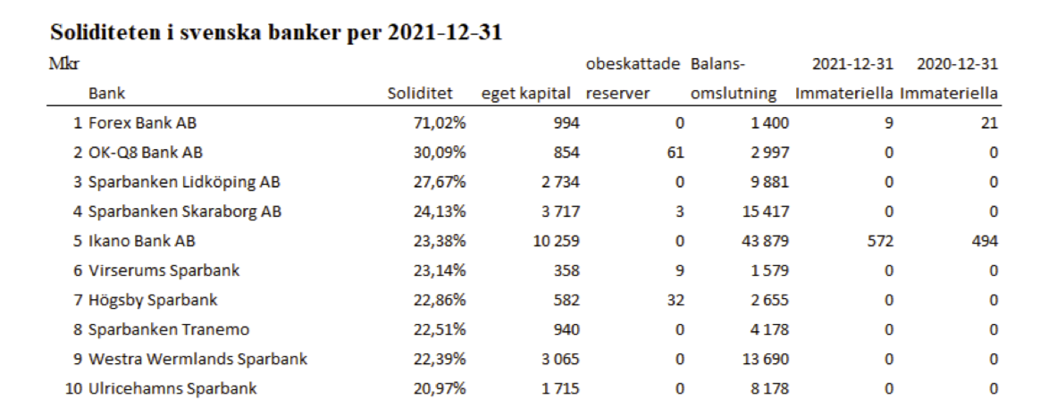 På förstaplats hamnar Forex Bank med en soliditet på 71 procent. Siffran sticker ut som den klart högsta, men hänger ihop med att ICA Banken köpte Forex bankverksamhet under 2021.