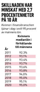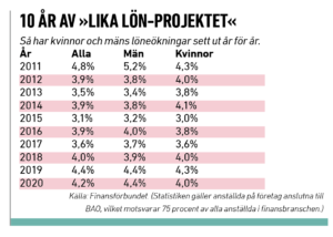 Kvinnor i finansbranschen tjänar i dag i snitt 95 procent av männens lön, jämfört med 92,3 procent 2011. Löneskillnaden har alltså bara minskat med 2,7 procentenheter på tio år. Endast under fyra av de år som Lika lön-projektet har pågått har kvinnorna fått högre löneökningar än männen. Under de övriga sex åren har männen fått mer.