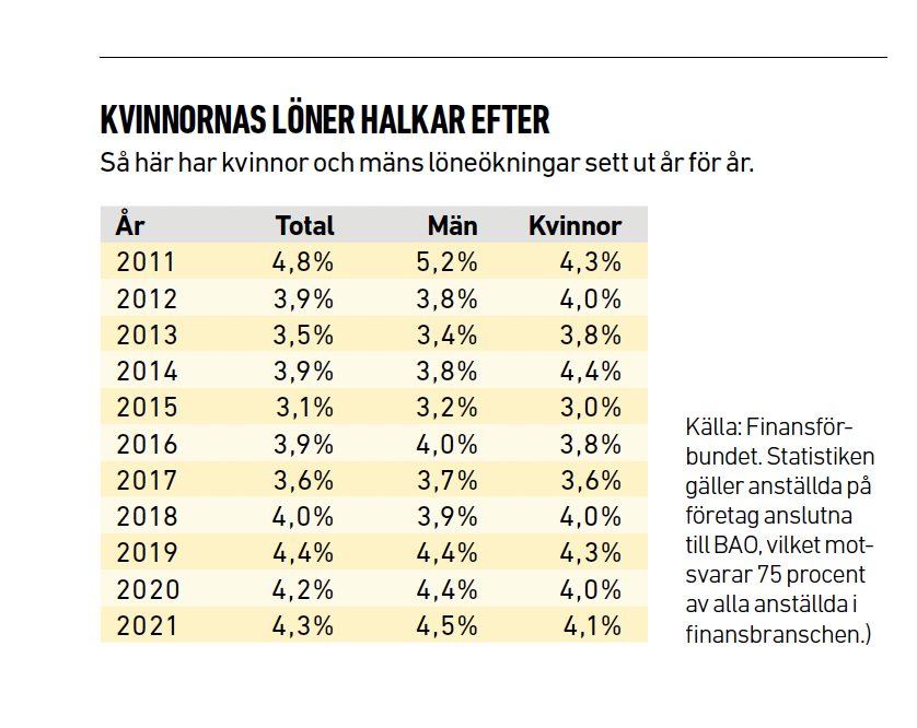 Från Finansförbundets sida var planen att vara i mål efter fyra-fem år. Projektet är nu inne på sitt elfte år och än är kvinnorna inte i kapp. Sedan 2011 har löneökningarna mätt i procent varit större för männen sju år, medan kvinnorna fått mer fyra år.