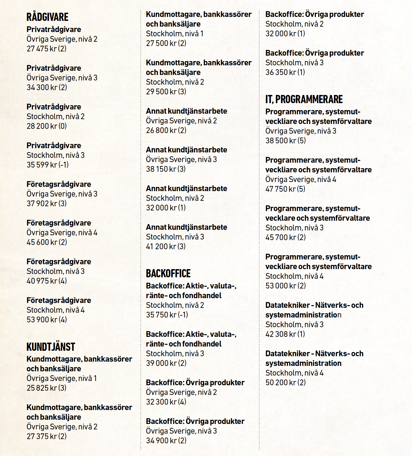 Exempelvis är lönerna för privatrådgivare i Stockholm i dag i kapp, liksom hela gruppen programmerare/systemutvecklare och systemförvaltare och kontorscheferna är näst intill framme.