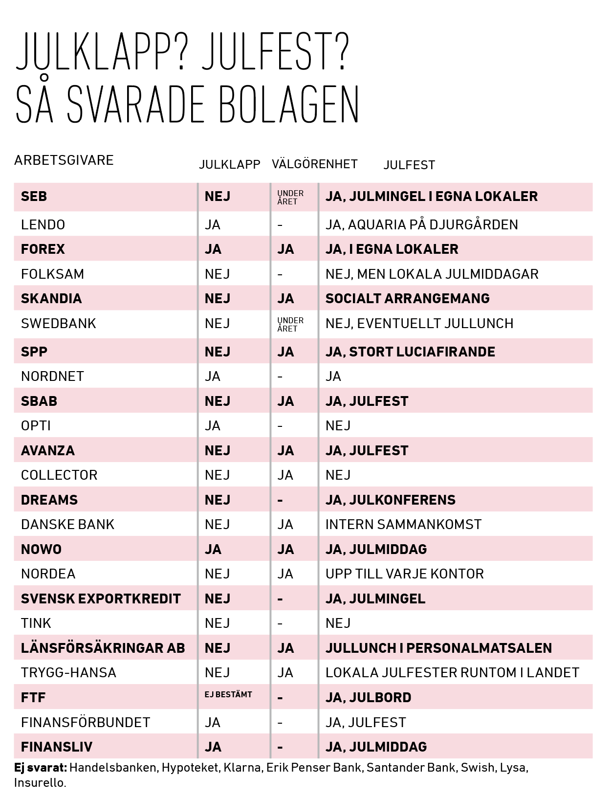 På jobbet De flesta arbetsgivare i bank- och försäkringsbranschen ger inte julklappar till sina anställda.