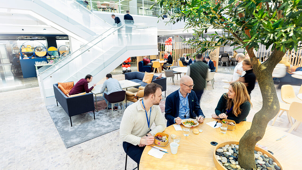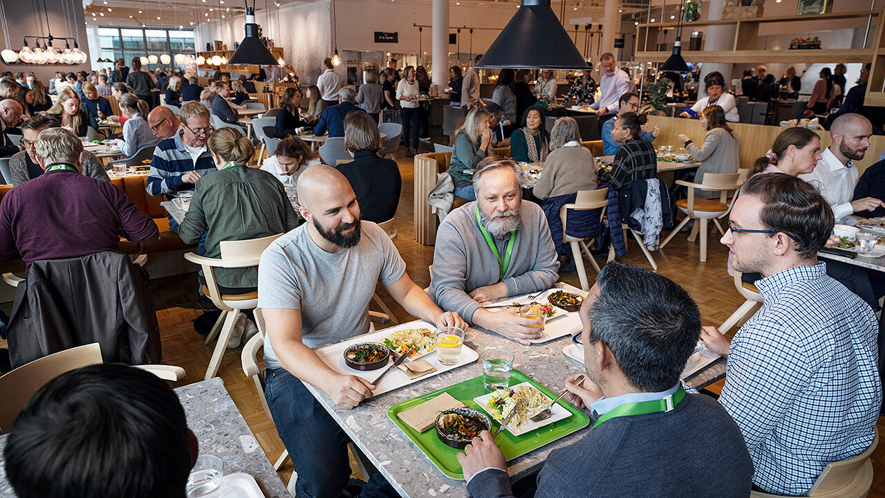 Efter pandemin har Resurs, likt många andra företag, gått över till flexibelt arbetssätt utifrån principen tre-två. Det blir därför särskilt högt tryck i lunchrummet tisdagar, onsdagar och torsdagar, eftersom de flesta gärna jobbar hemifrån måndagar och fredagar, berättar Mathias Durgaram.